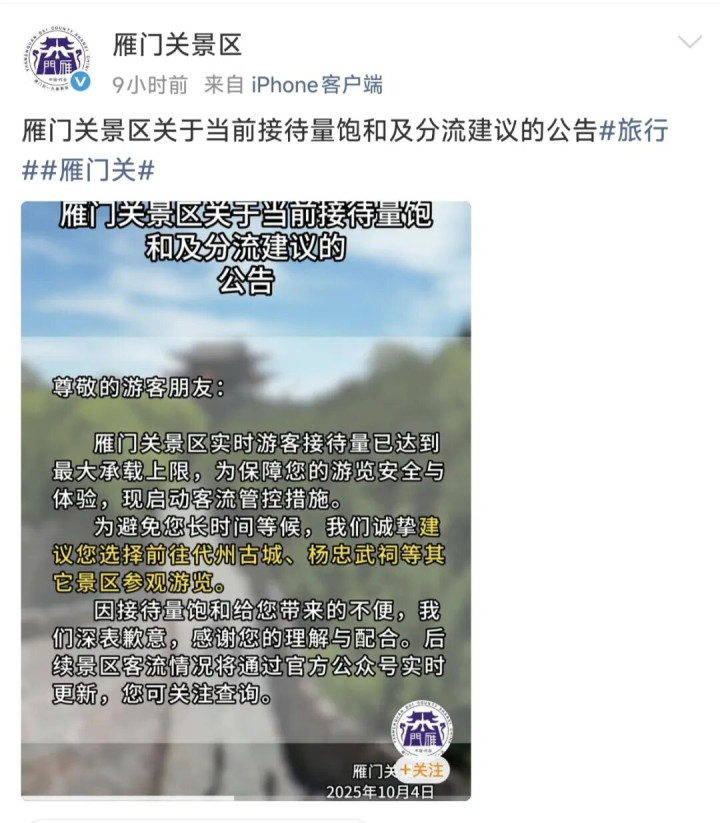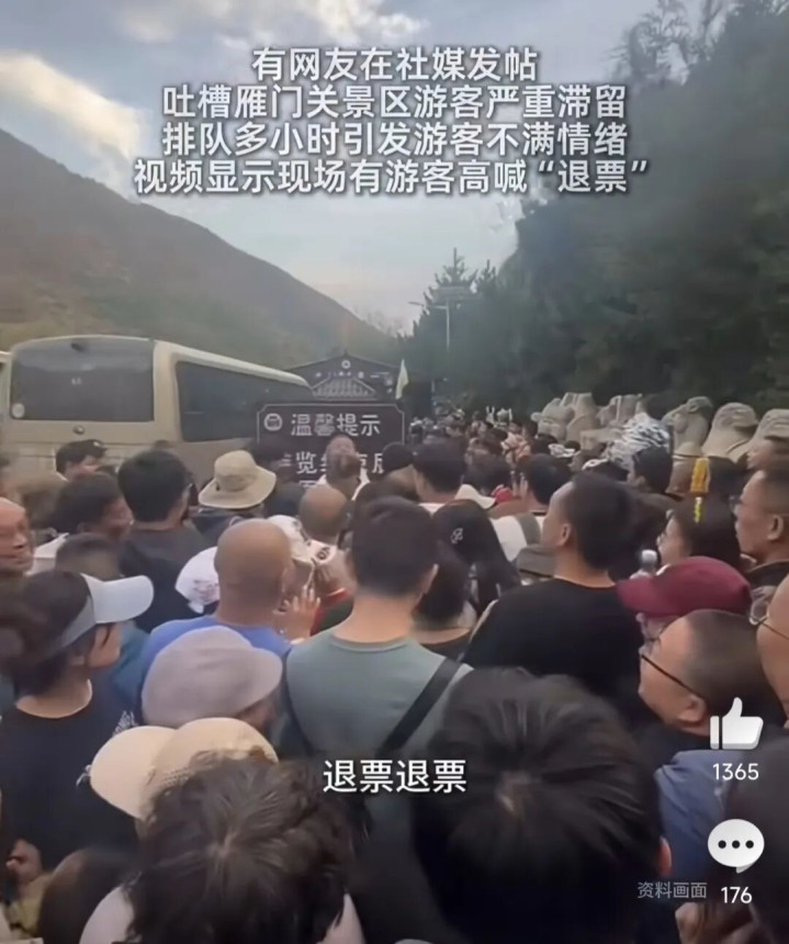 10月4日下午3时许,有网友发文称:“我揣着火热的心想去一下雁门关,可你给我拒绝在了八公里以外,用时速一公里的速度前行,最后退票走人。”
