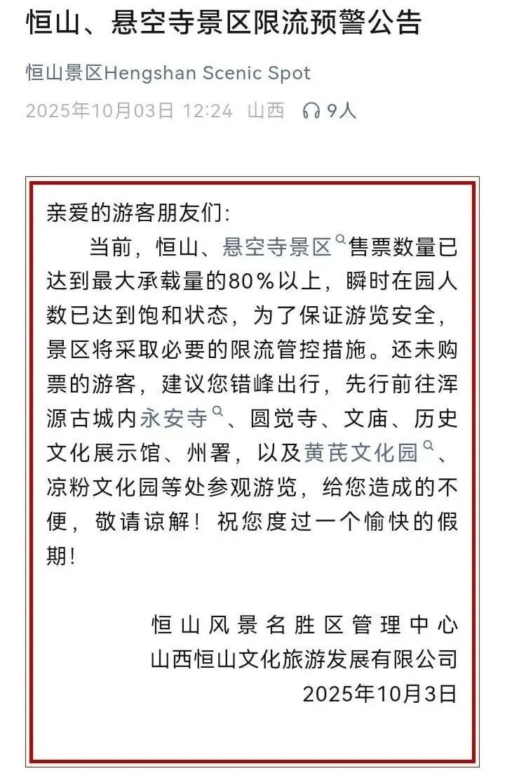媒体记者发现,有网友在社交平台发帖称,3日凌晨三点,就有游客拿着小凳子,在悬空寺景区购票大厅排队,开票半个小时,线下登临票就被售卖一空。