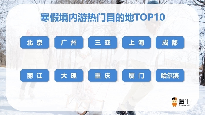 寒假境内游方面,北京、广州、三亚、上海、成都、丽江、大理、重庆、厦门、哈尔滨等目的地截至目前预订热度领先。冰雪旅游、主题乐园、避寒游、传统文化体验等主题的旅游产品深受游客青睐。